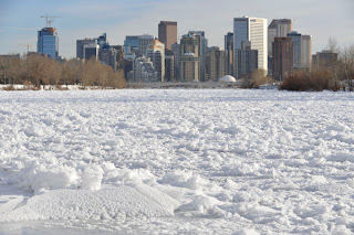 Le centre ville de Calgary : c'est haut, c'est neuf, c'est transparent. Voici quelques vues d'ensemble. Depuis le nord-ouest, un jour de grand froid... Oui la tache blanche au premier plan, c'est la Bow dans son habit hivernal.