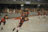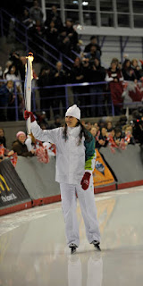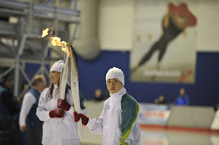 Le lendemain matin, la flamme arrivait à l'Olympic Oval (à l'université donc.) Triple médaillée (dont le bronze ici), Susan Auch fait encore quelques tours de pistes ; suivront dans le relais d'autres athlètes.