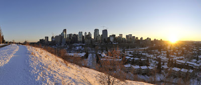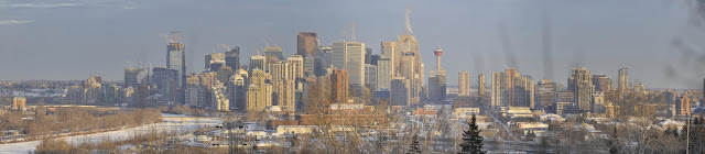 Oui, Calgary, ça s'étend très très loin... Il y a beaucoup d'arbres alors une vue comme ça donne l'impression de gratte-ciel au loin perdus dans la campagne. Pas vraiment. Il ne fait pas toujours beau aussi !! Un jour de temps fumeux, même endroit :