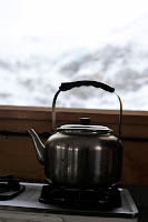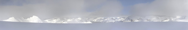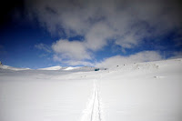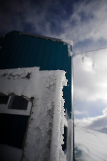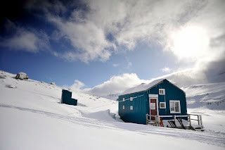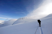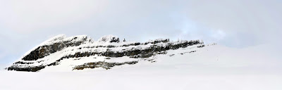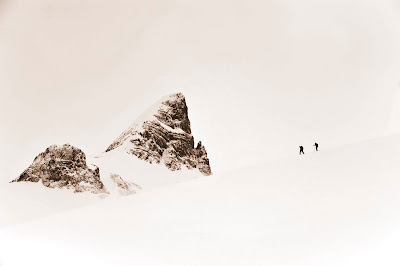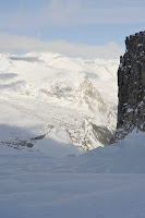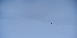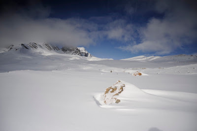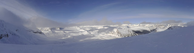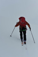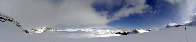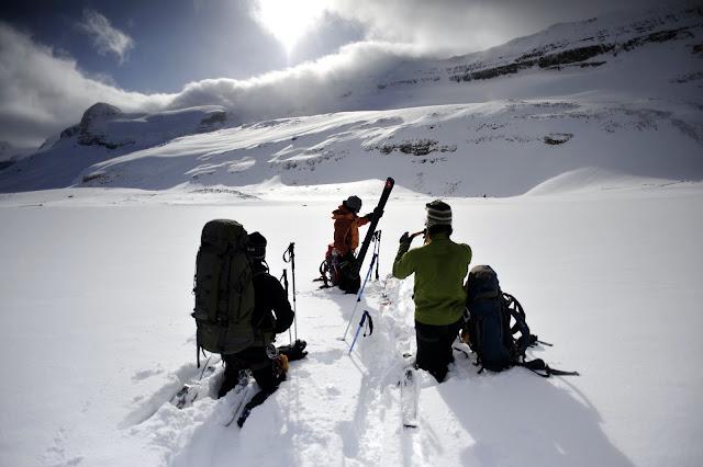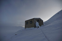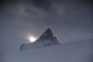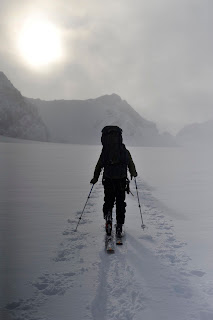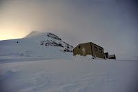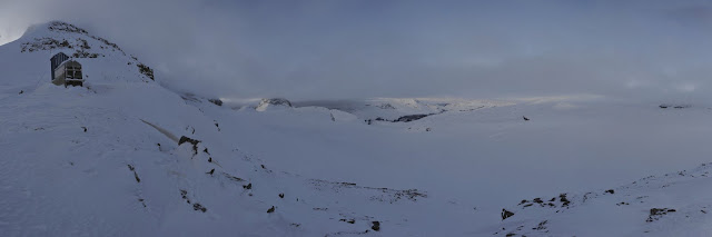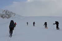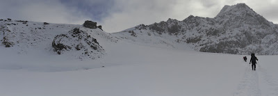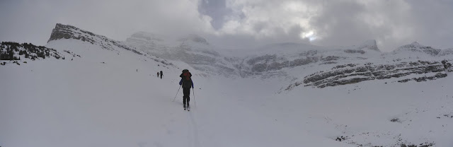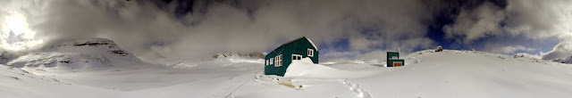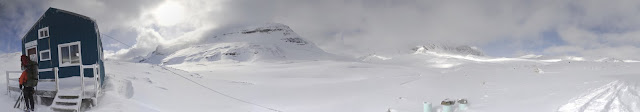 Trêve de plaisanterie. Il fait beau (presque), demain il fera mauvais (là on a tendance à croire la météo...) et il y a un passage délicat. Alors on ne s'arrête pas dans cette hutte et on se dirige directement vers Scott Duncan, la prochaine. On regarde encore un peu à gauche vers le beau temps et on met les peaux.