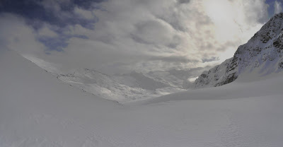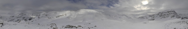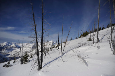 Dès qu'on a dépassé les arbres, la neige se fait de plus en plus rare. Premier but : le Storm Mountain est impossible à ski : pas de neige et très peu accueillant. On monte alors sur une crête sans nom en face.